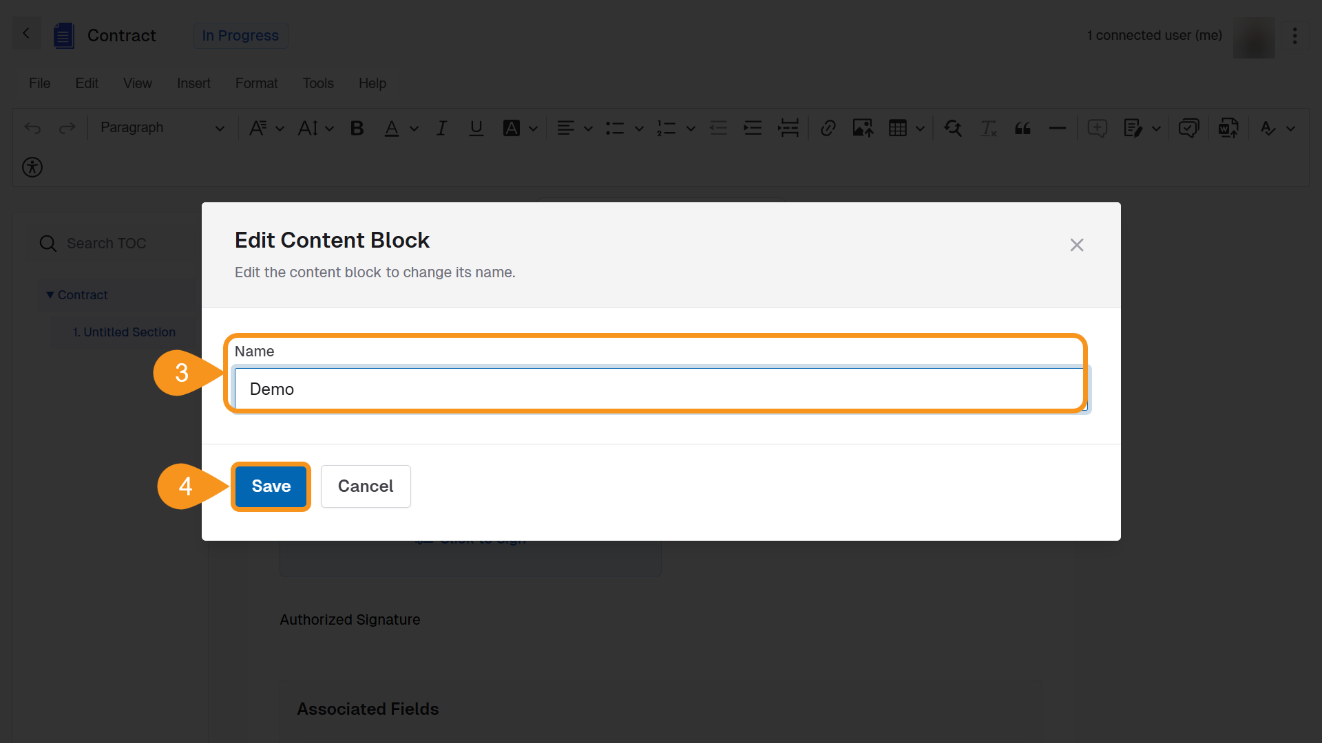 Signature blocks let you collect digital signatures directly within Authorium, linking signer name and date to project variables.